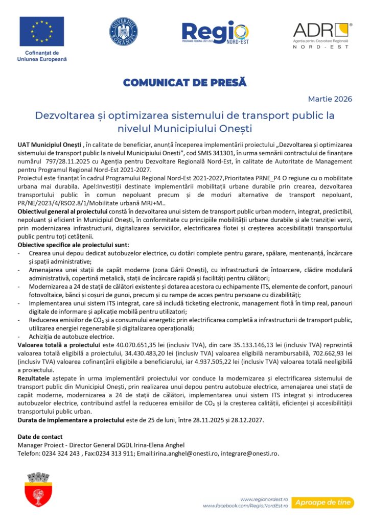 HomeNOUTĂȚIDezvoltarea și optimizarea sistemului de transport public la nivelul Municipiului Onești Dezvoltarea și optimizarea sistemului de transport public la nivelul Municipiului Onești March 17, 2026byadmin