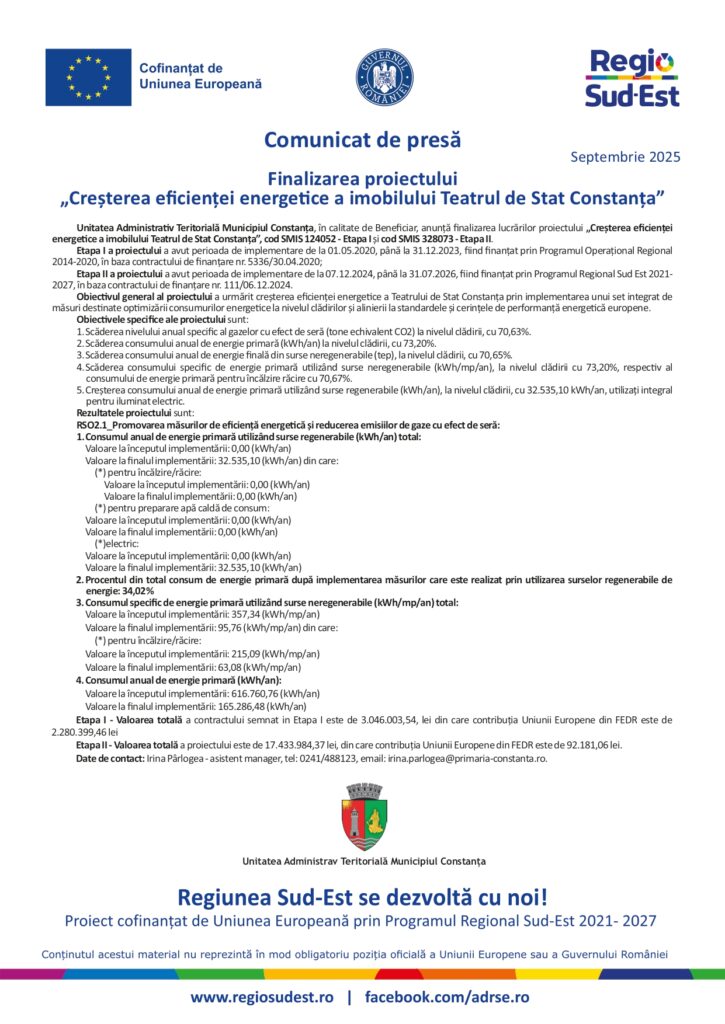 HomeNOUTĂȚIFinalizarea proiectului „Creșterea eficienței energetice a imobilului Teatrul de Stat Constanța” Finalizarea proiectului „Creșterea eficienței energetice a imobilului Teatrul de Stat Constanța” September 18, 2025byadmin