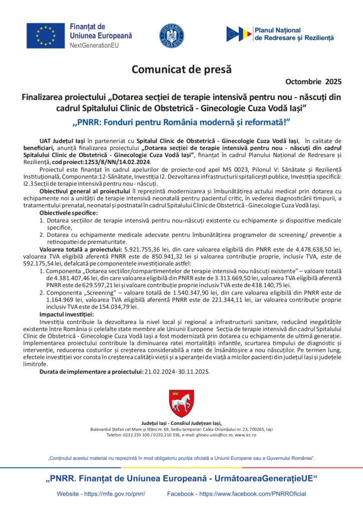 HomeNOUTĂȚIFinalizarea proiectului „Dotarea secției de terapie intensivă pentru nou – născuți din cadrul Spitalului Clinic de Obstetrică – Ginecologie Cuza Vodă Iași” Finalizarea proiectului „Dotarea secției de terapie intensivă pentru nou – născuți din cadrul Spitalului Clinic de Obstetrică – Ginecologie Cuza Vodă Iași” October 7, 2025byadmin