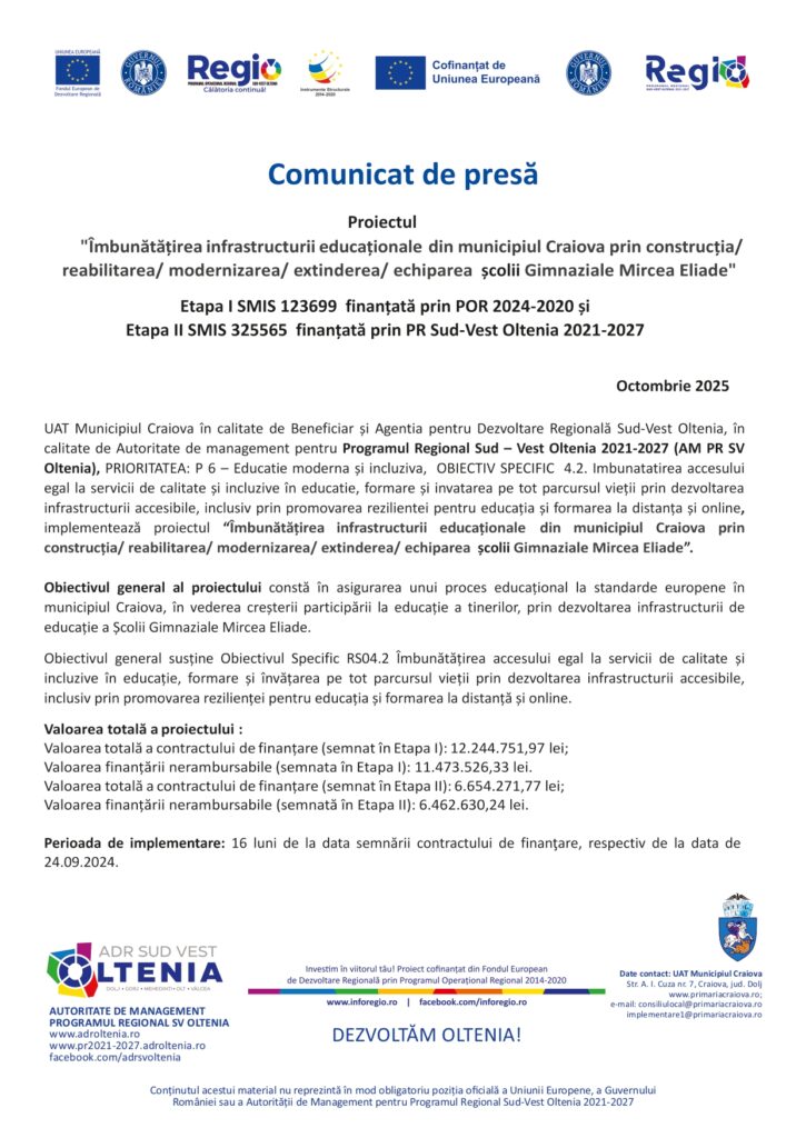 HomeNOUTĂȚIÎmbunătățirea infrastructurii educaționale din municipiul Craiova prin construcția/ reabilitarea/ modernizarea/ extinderea/ echiparea școlii Gimnaziale Mircea Eliade Îmbunătățirea infrastructurii educaționale din municipiul Craiova prin construcția/ reabilitarea/ modernizarea/ extinderea/ echiparea școlii Gimnaziale Mircea Eliade October 11, 2025byadmin