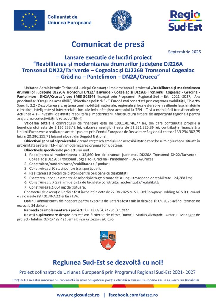 HomeNOUTĂȚILansare execuție de lucrări proiect “Reabilitarea și modernizarea drumurilor județene DJ226A Tronsonul DN22/Tariverde – Cogealac și DJ226B Tronsonul Cogealac – Grădina – Pantelimon – DN2A/Crucea Lansare execuție de lucrări proiect “Reabilitarea și modernizarea drumurilor județene DJ226A Tronsonul DN22/Tariverde – Cogealac și DJ226B Tronsonul Cogealac – Grădina – Pantelimon – DN2A/Crucea September 26, 2025byadmin